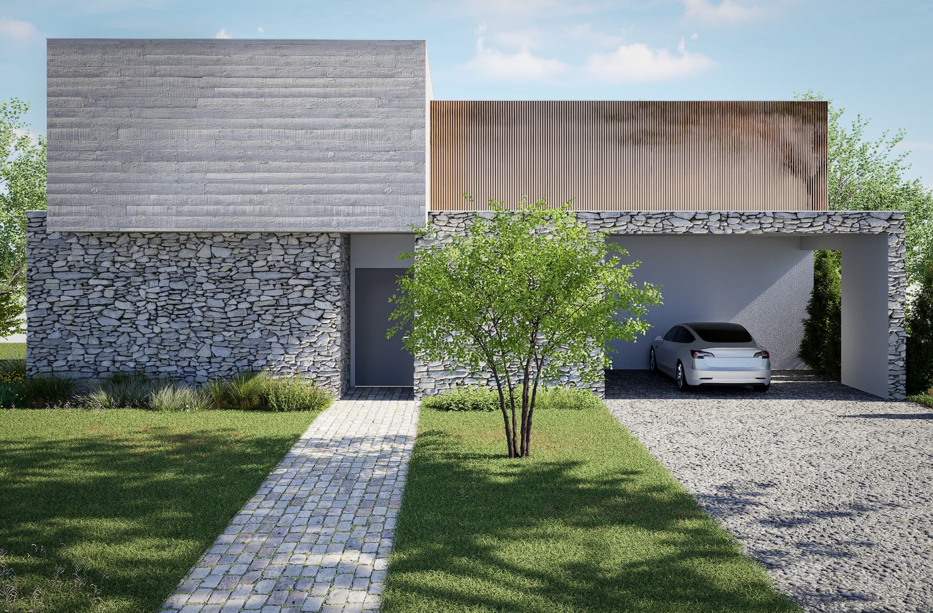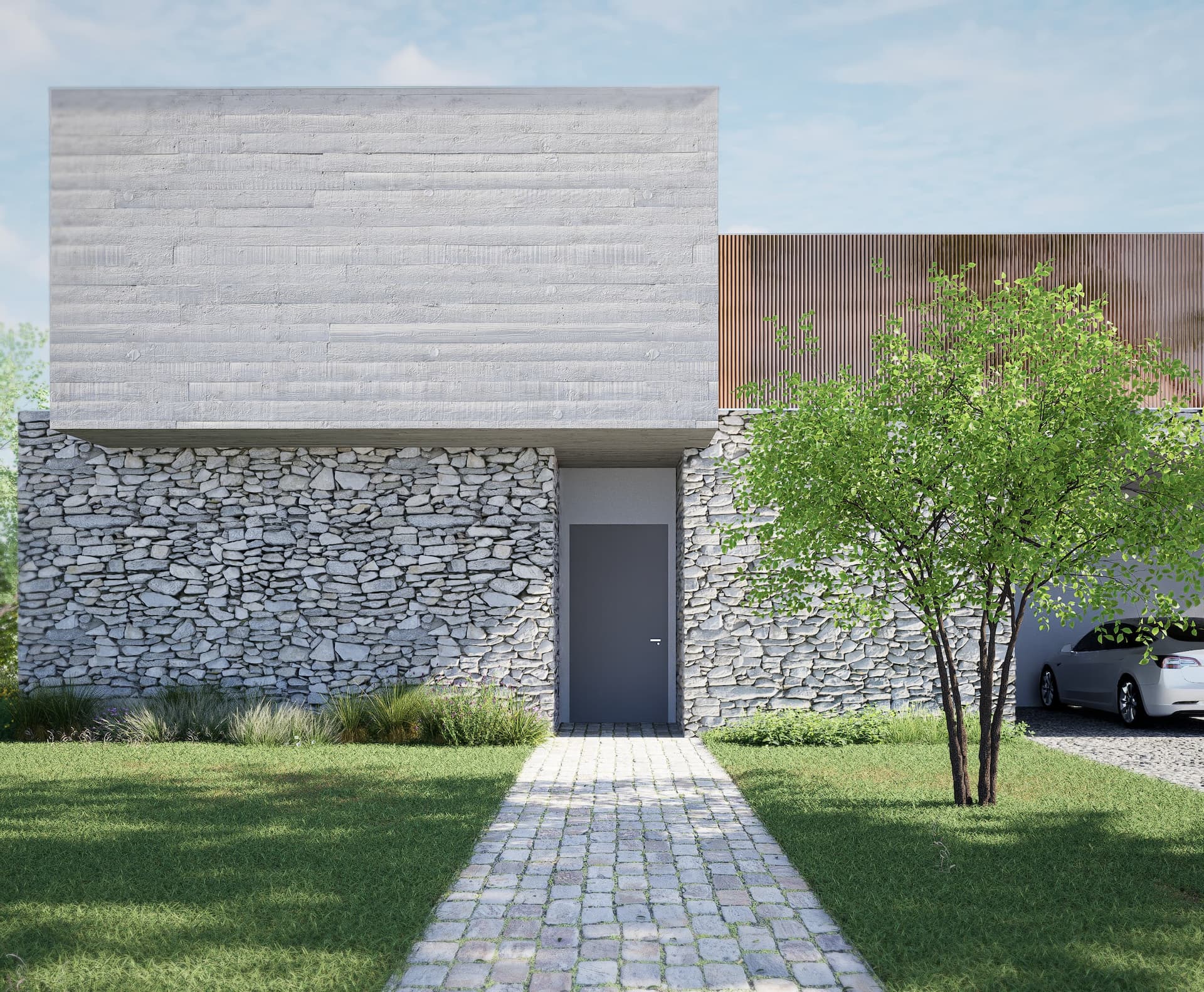 9.2 Materials: white facade, metal, concrete, and stone