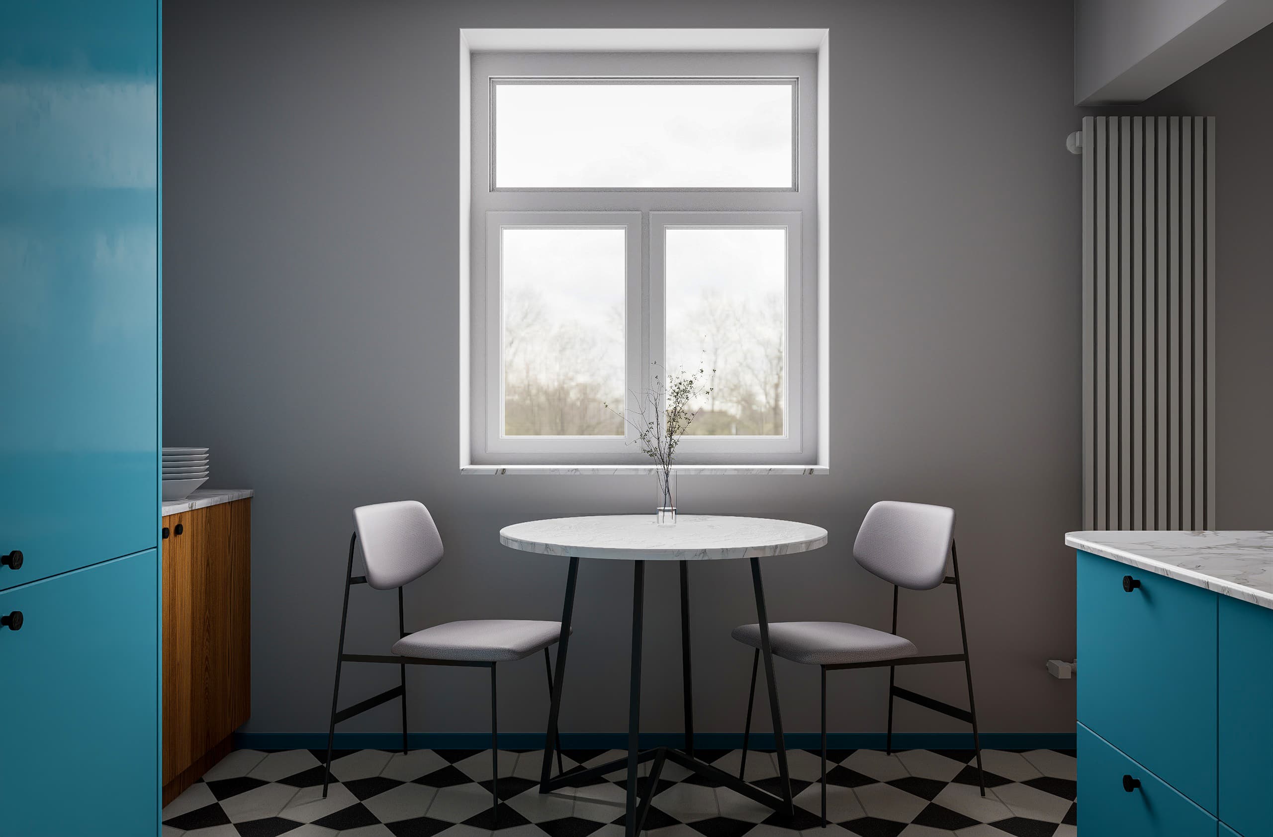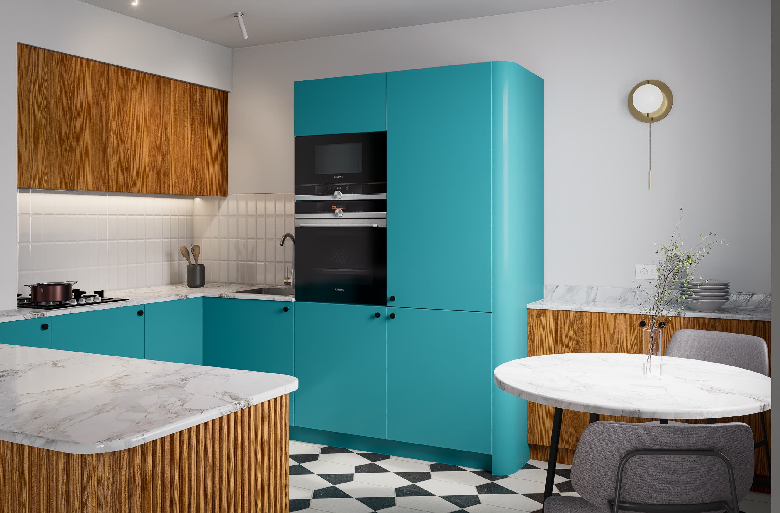 6.3 Wall material and blue cabinet fronts