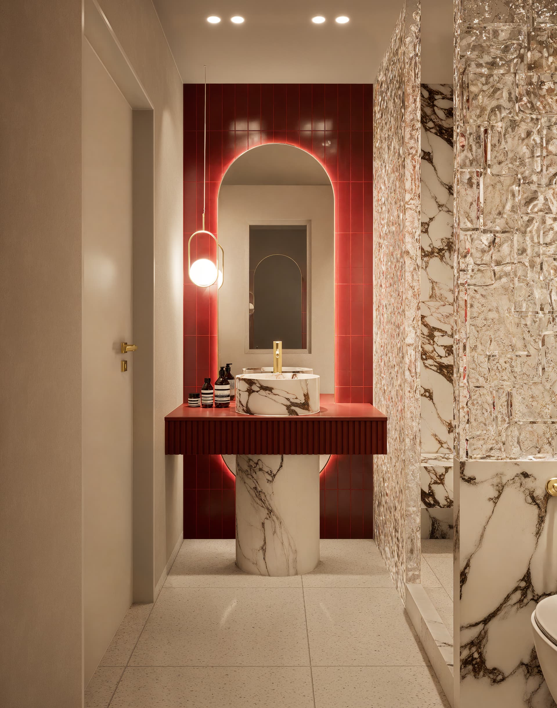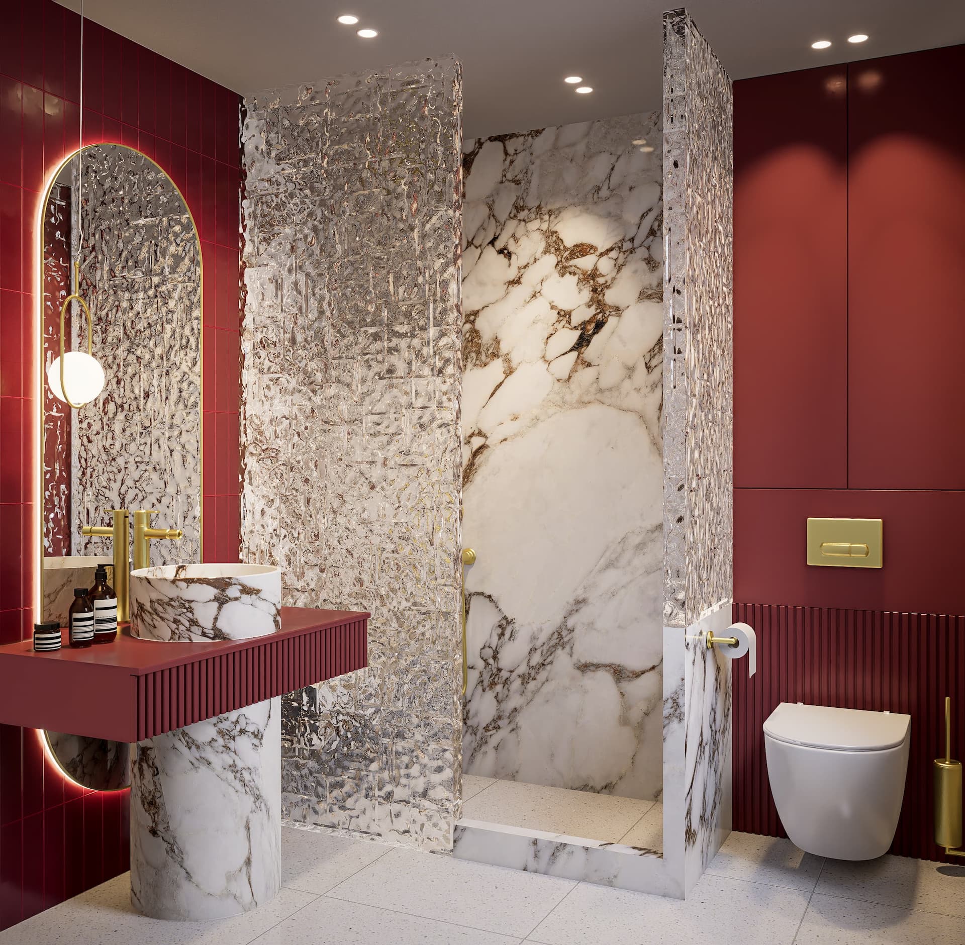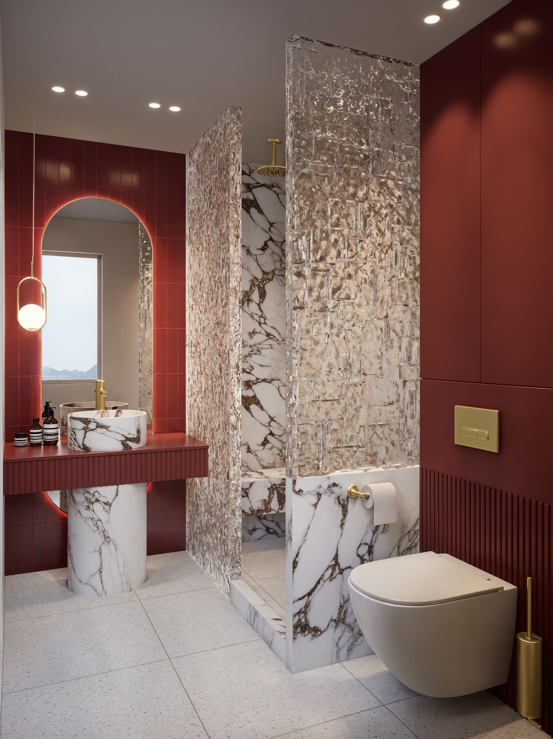 7.4 Materials: marble, cabinet fronts, shower glass, ceramics, and emissive materials